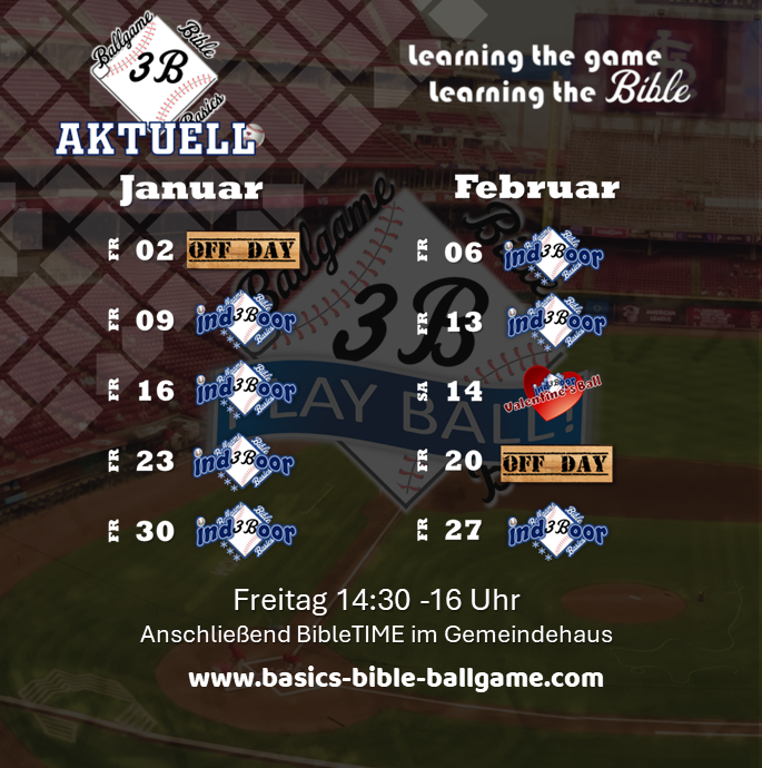 Nach dem vielversprechenden Auftakt geht es diesen Freitag, 16. Januar 1015 ab 14:30 Uhr weiter mit Indoor Baseball in der Sporthalle in Hülben. Gerne dürft ihr etwas früher zum Aufbau kommen. Danach geht es zur BibleTime ins Gemeindehaus in Hülben. Wir freuen uns darauf, Euch in der Halle zu begrüßen. Die letzte BibleTime gibt es…