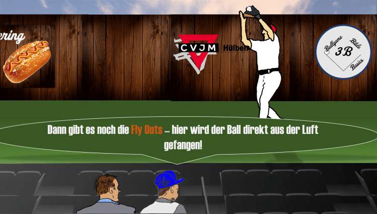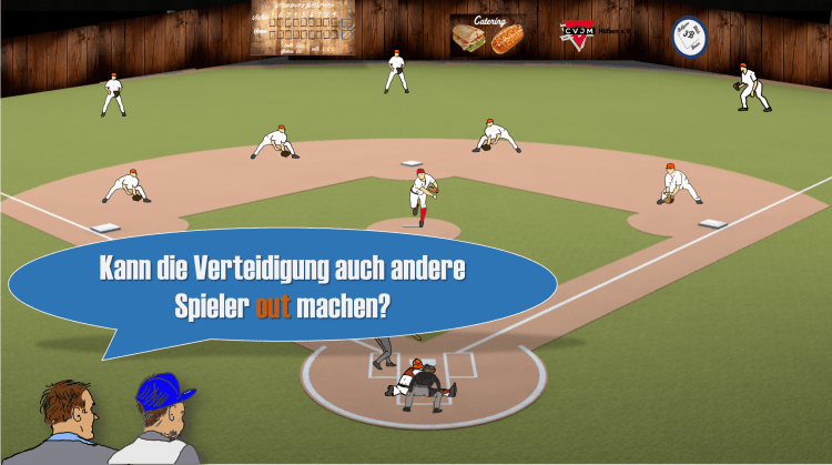 Die Verteidigung hat dabei drei Möglichkeiten, Gegner Out zu machen. Sie kann einen hoch geschlagenen Ball (oder irgendeinen geschlagenen Ball) fangen, bevor dieser den Boden berührt hat. Damit ist der Batter automatisch Out – ein sogenanntes Fly Out (Bild 2). Dabei gibt es noch eine wichtige Regel für die Runner: Sie sollten das Base erst verlassen, wenn der Ball im Handschuh des Verteidigers ist. Haben sie sich von der Base wegbewegt müssen sie zuerst zurück zu ihrer Base, diese berühren und dürfen dann erst losrennen (sofern sie eine Chance sehen, die nächste Base zu erreichen, bevor der Ball dort vom Verteidiger aufgenommen wird). Berühren sie die Base nicht, und der Ball wird an ihre Ausgangsbase geworfen, sind sie out.