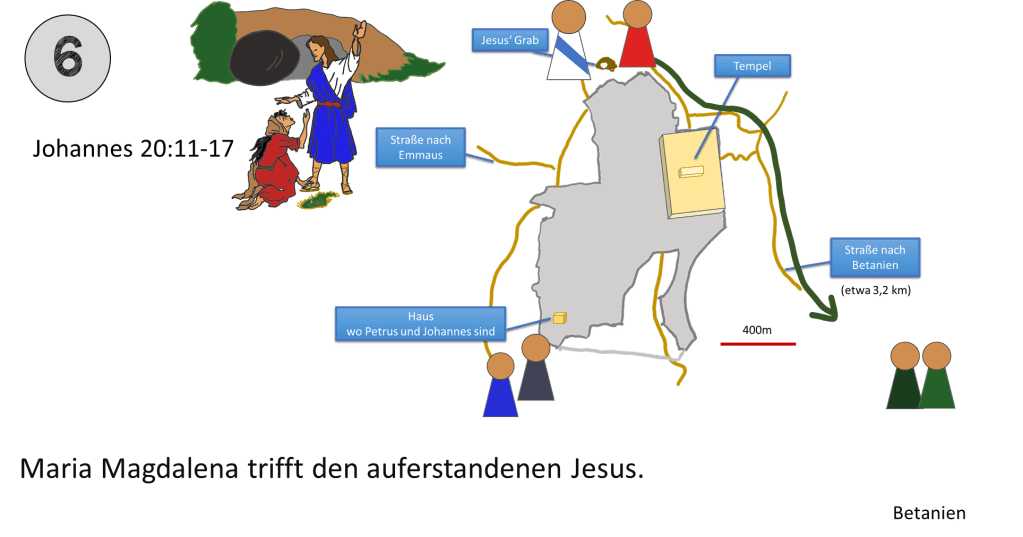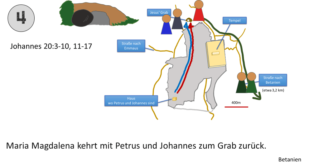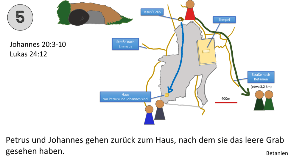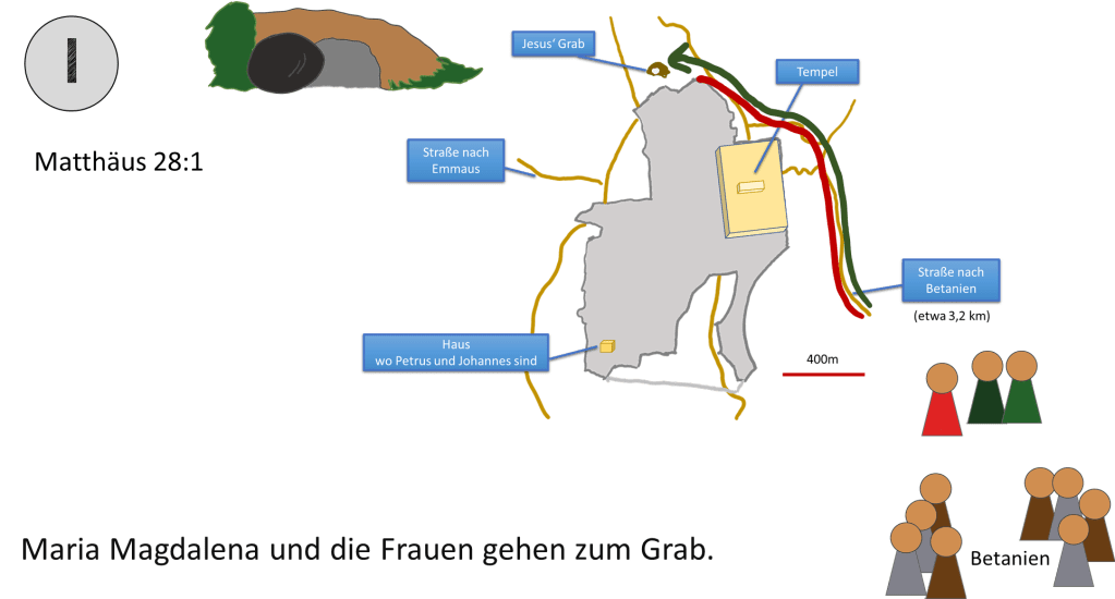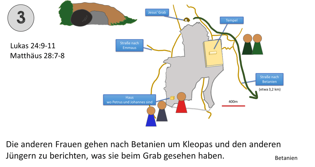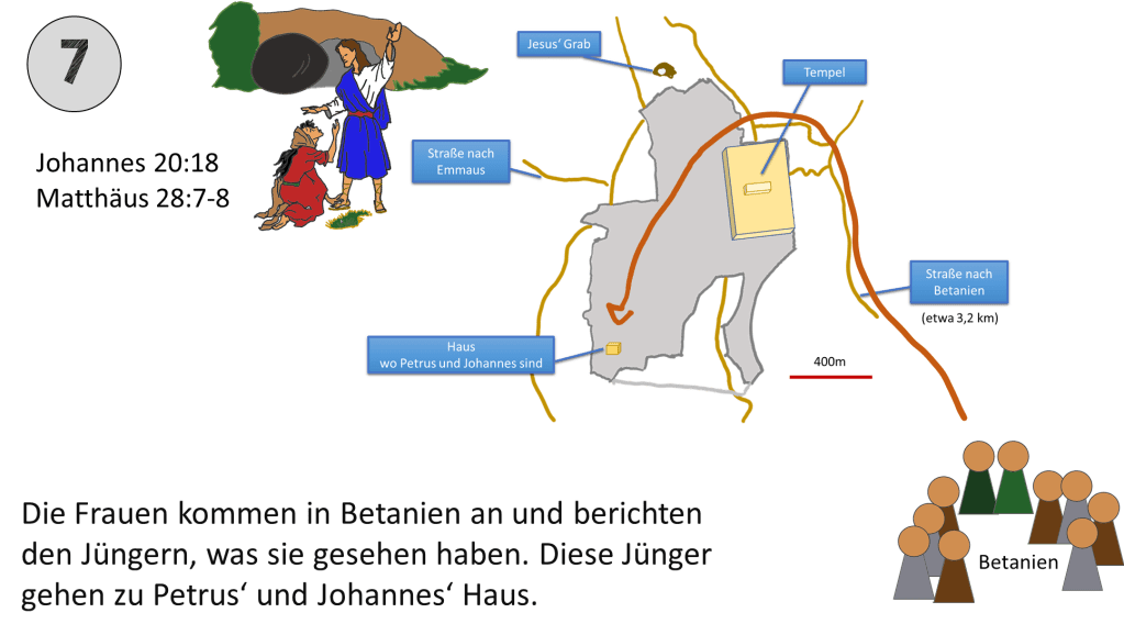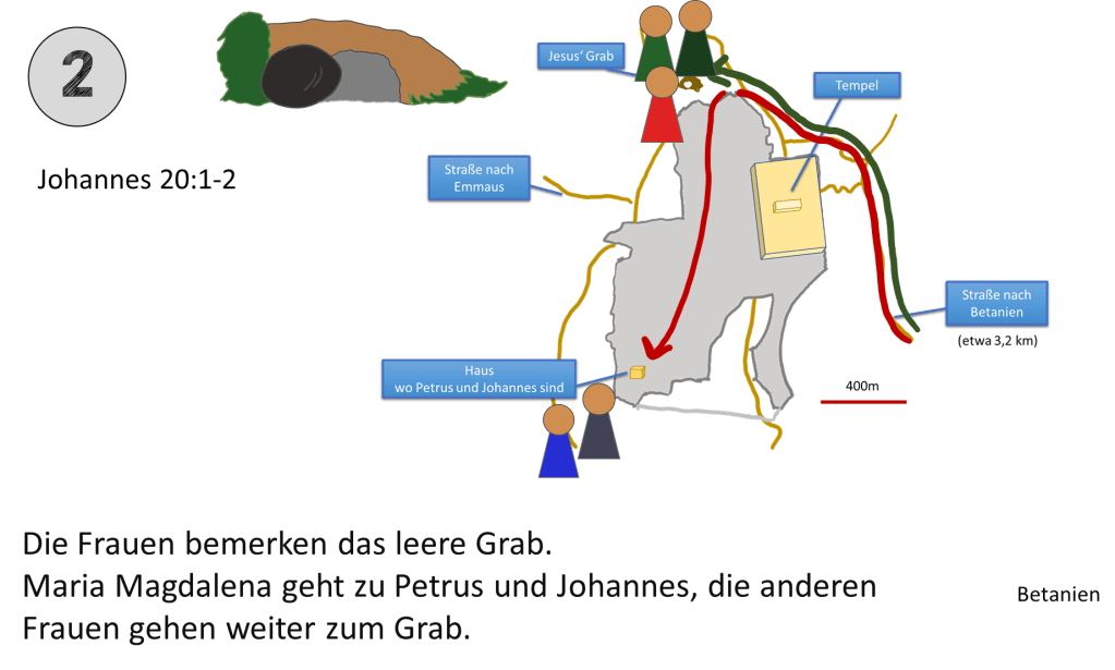 Die Frauen und Jünger hätten auch im Süden von Jerusalem die Stadt betreten können. Der Weg nach Norden macht dann Sinn, wenn General Gordons Verortung richtig ist. Aus diesem Grund wurde für diese Karte dieser Verlauf gewählt.