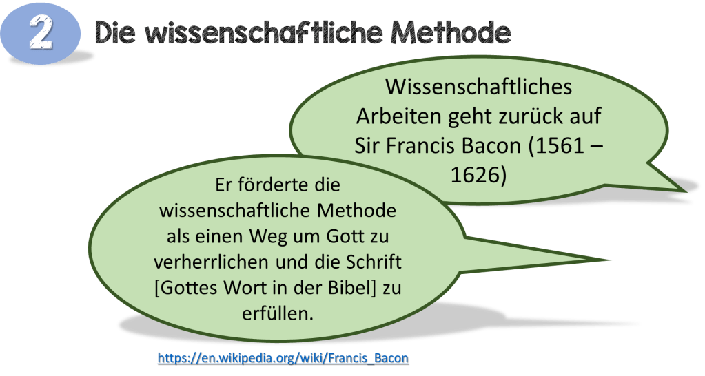 „Die Wissenschaft“ gibt es nicht – Wissenschaft ist keine Person, sondern eine Methode, mit der wir unsere Welt untersuchen können. Wissenschaftliches Arbeiten geht zurück auf Sir Francis Bacon (1561 – 1626). Er wurde berühmt für seine Rolle in der Wissenschaftlichen Revolution, die während des Mittelalters begann (6. – 15. Jahrhundert). Er förderte die wissenschaftliche Methode als einen Weg um Gott zu verherrlichen und die Schrift [Gottes Wort in der Bibel] zu erfüllen[i].