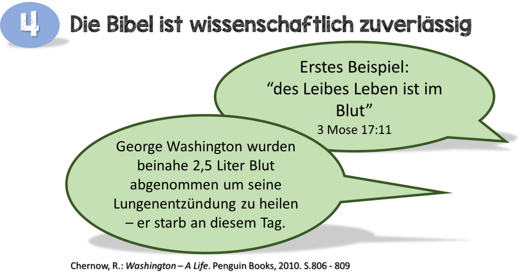 Aus den vielen Beispielen, die es gibt und die Gottes Wort bestätigen, stellt dieser Artikel zwei vor. Das erste Beispiel ist blutig: George Washington (1732-1799), der erste Präsident der USA, zog sich im Dezember 1799 eine schwere Lungenentzündung zu. In dieser Zeit war es üblich Krankheiten durch „Aderlassen“ zu behandeln. Dabei wurde dem Patienten eine Vene aufgeschnitten und Blut entnommen. Auf diese Weise sollten die krank machenden Substanzen aus dem Körper entfernt werden. Nach zeitgemäßem Wissen entnahm George Washingtons Arzt ihm Blut – doch anstelle einer Besserung verschlechterte sich der Zustand des Patienten. Also wurde ihm noch mehr Blut entnommen, solange, bis George Washington beinahe 2,5 Liter Blut abgenommen waren[iii]. Noch am Abend dieses Tages (14. Dezember) verstarb George Washington[iv].