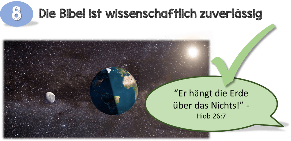 Es gibt noch weitere Beispiele für die wissenschaftlich Genauigkeit der Bibel: Im Buch Hiob steht, dass Gott den Norden über dem Leeren ausspannt und die Erde über das Nichts hängt (Hiob 26:7). Zu der Zeit, als diese Zeilen geschrieben wurden, war es nicht allgemein bekannt, dass die Erde sich in einem riesigen, beinahe leeren Raum – dem Universum – bewegt.