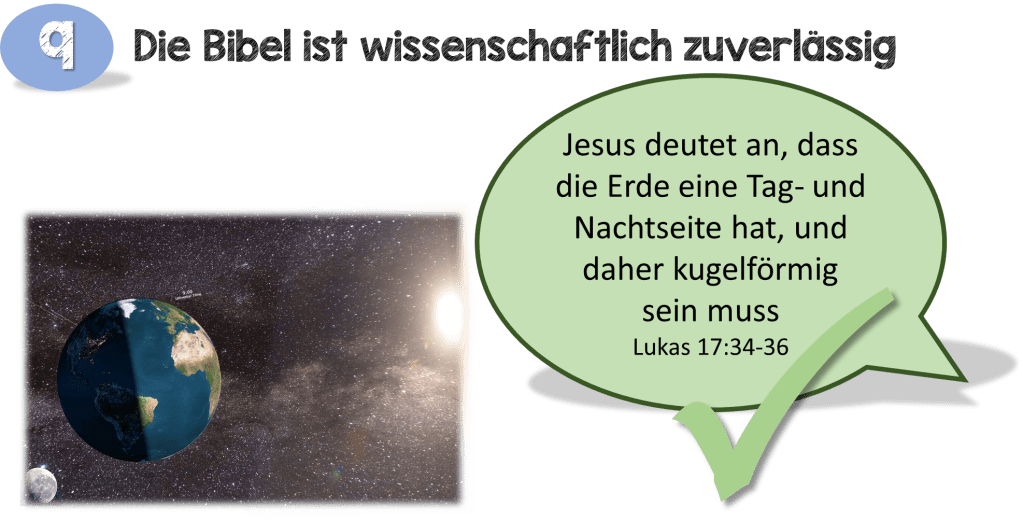 Übrigens ist es ein Missverständnis, dass die Bibel lehre, die Erde sei eine Scheibe[vii]. Es gibt verschiedene Verweise auf eine kugelförmige („runde“) Erde in der Bibel. Eine davon findet sich in Lukas 17:34-36. Jesus spricht über seine Wiederkunft. Dabei werden manche bei Nacht im Bett gefunden (V34) und wieder andere beim Kornmahlen (V35). Dies ist nur möglich, wenn die Erde eine Kugel ist, die eine Nacht- und Taghälfte hat.