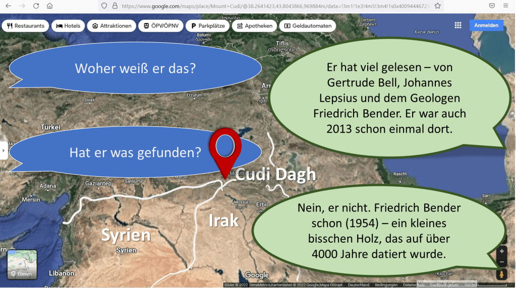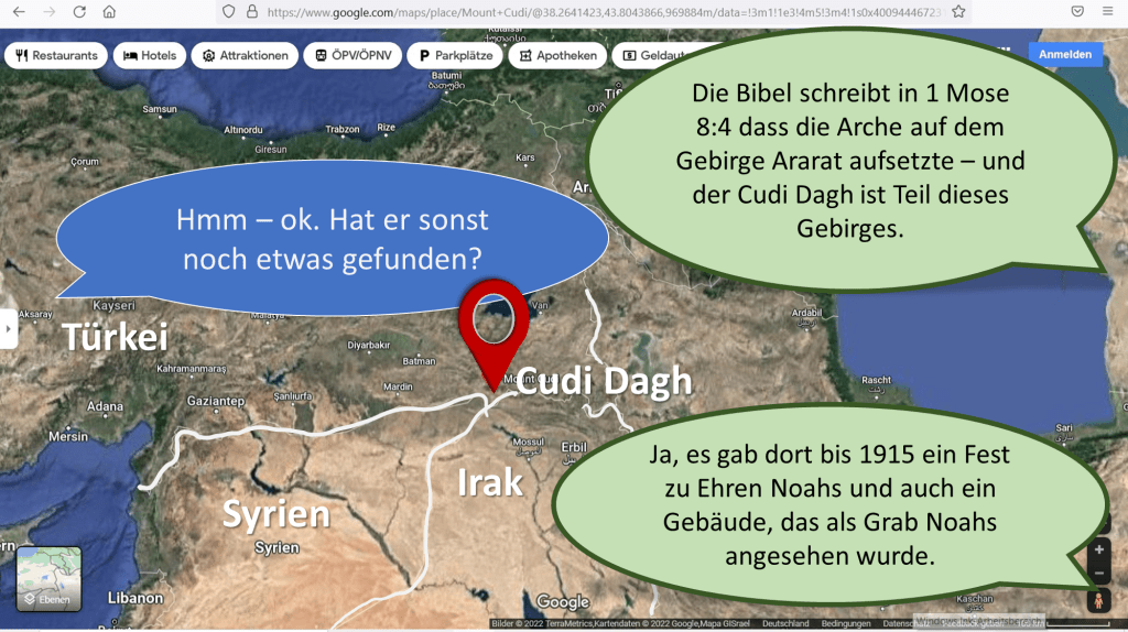 In seinem Buch „Das Rätsel der Arche Noah“[iii] beschreibt Timo Roller unter anderem seine Reise in das Gebirge Ararat im Dreiländereck zwischen der Türkei, Syrien und dem Irak, etwa 15 Autostunden (900 – 1000km) vom Berg Ararat in Armenien entfernt. Zusammen mit anderen Experten, unter anderen Prof. Dr. John Baumgardner aus Kalifornien und Bill Crouse aus Texas, kommt er zu dem Schluss, dass die bisherigen Expeditionen auf der Suche nach der Arche am falschen Ort gesucht haben. Im besagten Dreiländereck befindet sich der Cudi Dagh (Berg Cudi) der in Berichten von Gertude Bell und Friedrich Bender als möglicher Landeplatz der Arche erwähnt wird. Auch gibt es in Schriften früher Kirchenväter Hinweise darauf, dass diese den Cudi als Landeplatz der Arche ansahen[iv].