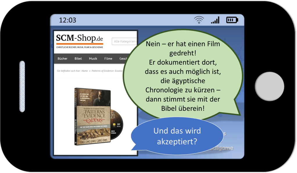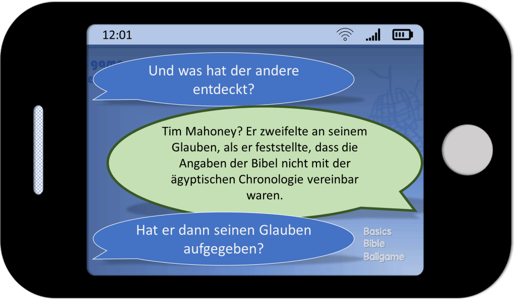 Tim Mahoney traf unter anderen auf David Rohl, einen Ägyptologen, der eine neue Hypothese zur Chronologie des Alten Ägyptens entwickelte. Obwohl D. Rohl nicht an Jesus glaubt, betrachtet er die biblischen Texte als historisch zuverlässig und nimmt diese als Ausgangspunkt für seine neue Chronologie. Mit Hilfe dieser Herangehensweise wird die ägyptische Zeitleiste deutlich kürzer und die in der Bibel berichteten Ereignisse können mit der ägyptischen Chronologie synchronisiert werden[ix].