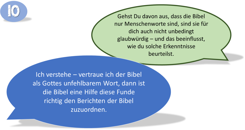 Alle Beteiligten haben lange nach den Ereignissen der Sintflut oder des Auszugs gelebt, oder leben noch heute. Keiner ist Augenzeuge des Geschehenen und leider kommen Artefakte nicht mit einem Datumsstempel. Die Schlussfolgerungen und Ergebnisse der Forschung sind immer abhängig vom Weltbild des Experten. Werden die Berichte der Bibel als Mytholgie oder überhöhte religiöse Erzählungen betrachtet, sind diese Berichte für den Forscher von vornherein nicht zuverlässig und enthalten nicht die Wahrheit. Betrachtet der Experte die Berichte der Bibel als Gottes Worte, die die Wahrheit enthalten, sind sie ihm ein Instrument um seine Entdeckungen zu deuten. Die Frage ist nicht ob Wissenschaft oder Bibel, die Frage ist: Was ist für dich die Bibel? Gottes Wort oder Menschenwort?