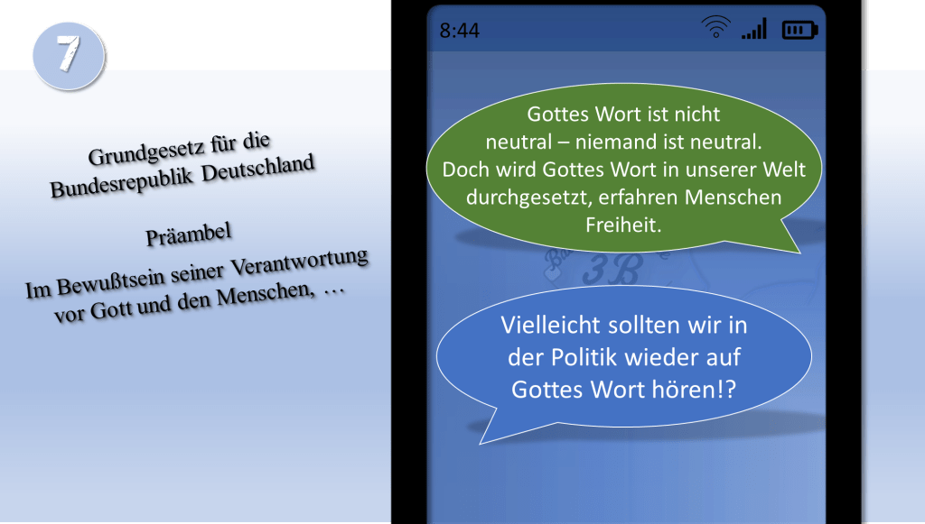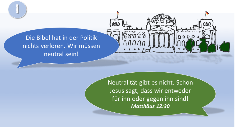 „Bibel und Politik sollten nicht miteinander vermischt werden. Wir müssen neutral sein!“ – Diese Aussage ist auch für viele Christen ein Argument sich nicht in der Politik zu engagieren. Doch diese Neutralität gibt es nicht. Schon Jesus sagte: „Wer nicht mit mir ist, der ist gegen mich; und wer nicht mit mir sammelt, der zerstreut.[i]“ Und er machte auch deutlich, dass wir nicht zwei Herren dienen können[ii], was dann Paulus in einem Brief den Christen in Rom noch einmal erklärt, „Wisst ihr nicht? Wem ihr euch zu Knechten macht, um ihm zu gehorchen, dessen Knechte seid ihr und dem gehorcht ihr – entweder als Knechte der Sünde zum Tode oder als Knechte des Gehorsams zur Gerechtigkeit.“[iii]