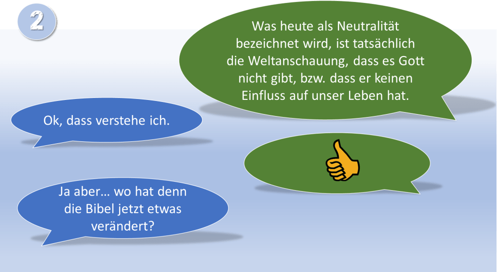 Jesus sagt uns, dass wir immer jemandem nachfolgen, wenn nicht ihm, dann jemandem anderen oder der Weltanschauung eines Menschen. Niemand ist neutral. Momentan ist die bestimmende Weltanschauung, dass Gott und sein Wort keinen Einfluss auf das Leben der Weltbevölkerung haben sollte. Anstelle von Gottes Worten sind die Worte, Ideen und Visionen von Menschen die Grundlage der Entscheidungen in der Politik[iv]. Was heute als Neutralität verstanden wird, ist die Weltanschauung, dass es Gott nicht gibt, bzw. dass er keinen Einfluss auf unser Leben hat.