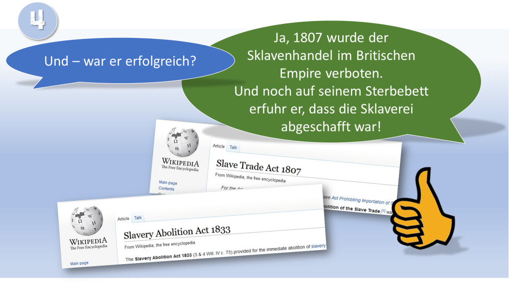 Wilberforce und John Newton beriefen sich unter anderem auf Apostelgeschichte 17:26 „Und er hat aus einem Menschen [Adam. Anm. des Autors] das ganze Menschengeschlecht gemacht, […]“. Aus diesem Vers schlossen sie, dass alle Menschen ein Ebenbild Gottes sind und daher mit Respekt und Würde behandelt werden müssen. Diesen Vers zitierte W. Wilberforce dann auch in einer Rede vor dem Parlament im Jahr 1807 nach einem zwei Jahrzehnte dauernden Bemühen, den Sklavenhandel abzuschaffen[viii]. Im März des gleichen Jahres wurde der Sklavenhandel im Britischen Empire verboten. Doch dies bedeutete noch nicht das Ende der Sklaverei. Erst 1833 erhielt W. Wilberforce auf seinem Sterbebett die gute Nachricht, dass die Sklaverei abgeschafft worden war.