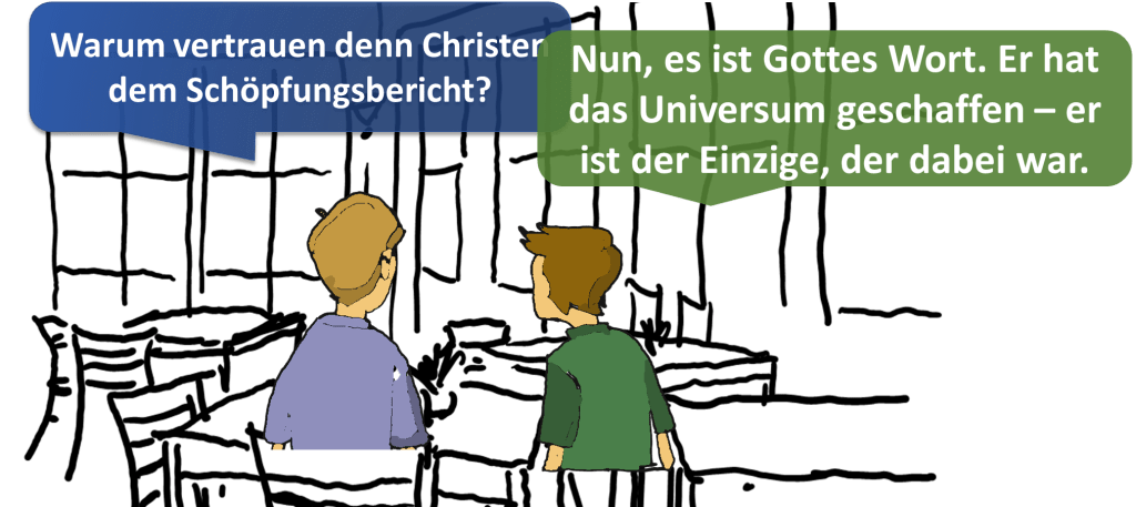 In 2 Korinther 10:5[ii] wird uns gesagt, dass wir unser ganzes Denken auf Gottes Wort (die Bibel) gründen sollen und wir auch jeden Gedanken daraufhin prüfen sollen, dass er Gottes Wort nicht widerspricht. Deshalb vertrauen Christen dem Schöpfungsbericht hauptsächlich deshalb, weil er in der Bibel, Gottes Wort, festgehalten und die Ereignisse dort berichtet werden.