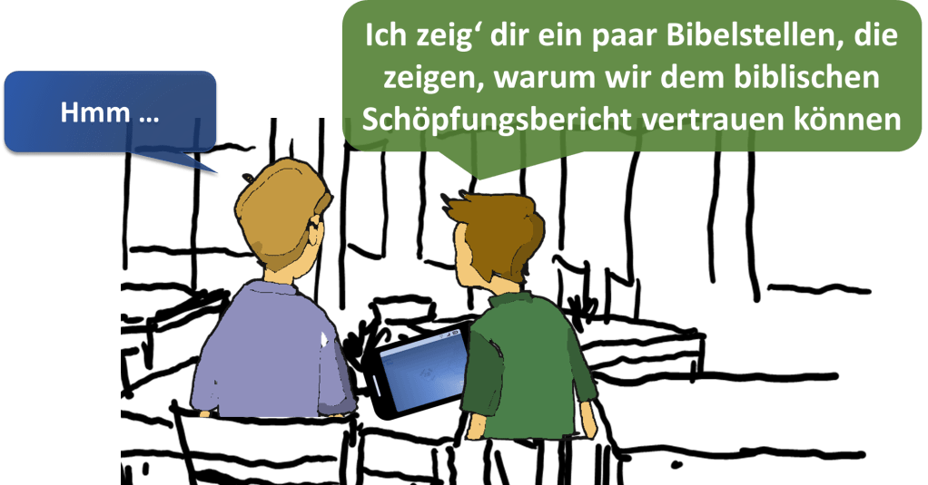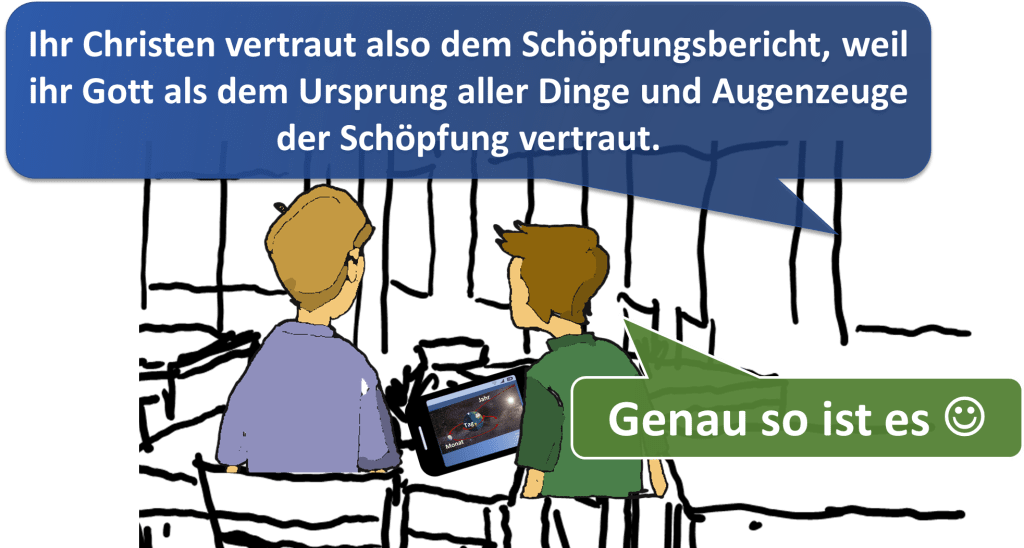 In 1 Mose 1 und 2 haben wir den perfekten und eigenhändigen Augenzeugenbericht Gottes, des Schöpfers, vor uns. Wenn wir Gott als unseren HErrn anbeten sollten wir Seinem Augenzeugenbericht auch vertrauen. Dazu lesen wir in 2 Timotheus 3:16 dass die Bibel Gottes Worte sind, die wir als Lehrbuch im Unterricht und bei der Erziehung nutzen sollen[vi].