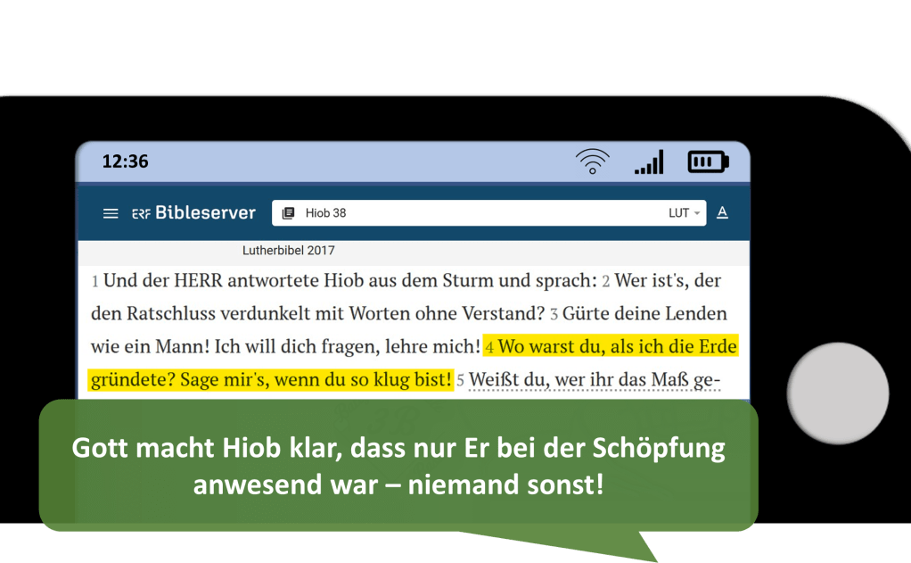 In Hiob 38:4 fragt Gott Hiob (einen Mann der in schwerem Leiden seinen Glauben an Gott bewahrte und zu einer persönlichen Beziehung zu Ihm fand): „Wo warst du, als ich die Erde gründete? Sage mir’s, wenn du so klug bist!“ Für uns ist wichtig zu verstehen, dass Gott der Einzige ist, der bei der Schöpfung anwesend war. Es gibt außer Gott keinen weiteren Augenzeugen.