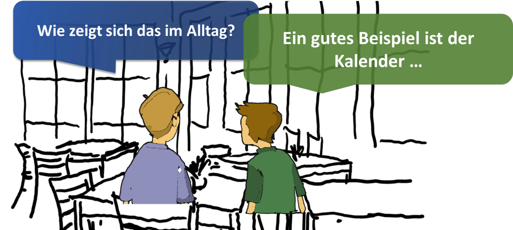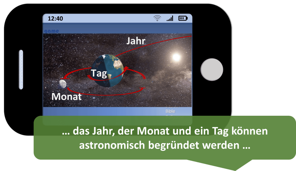 [iii] Für die 7-Tage Woche gibt es in der Astronomie keine Begründung. Der Tag ergibt sich aus der Umdrehung der Erde um ihre eigene Achse, der Monat aus dem Orbit des Mondes um die Erde (etwa 29 Tage) und das Jahr aus dem Orbit der Erde um die Sonne (etwa 365 Tage).