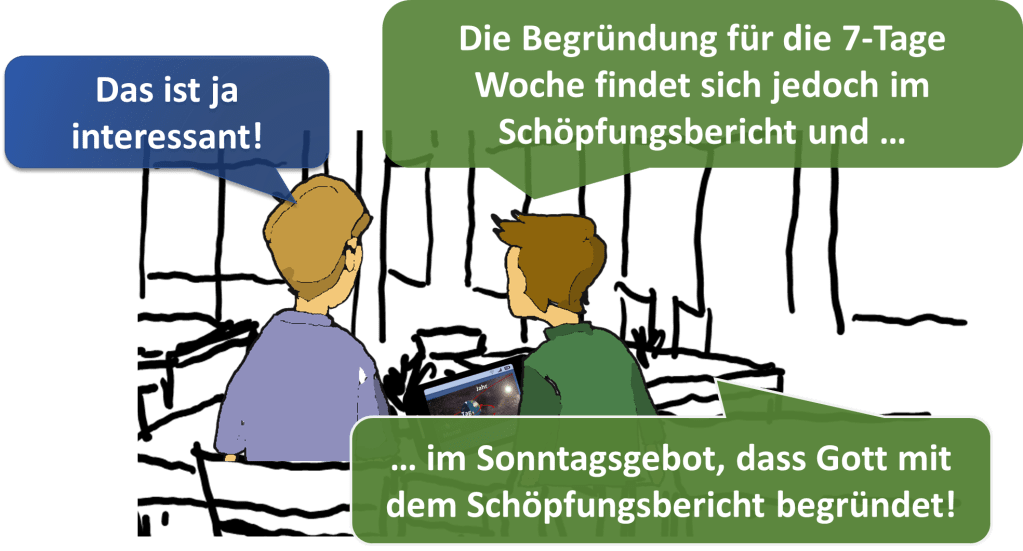 Im ersten Buch Mose 1. und 2. Kapitel gibt uns Gott einen klaren historischen Bericht seines göttlichen Schöpfungshandeln. In 2 Mose 20:11 und 31:17 wiederholt er diesen Bericht über seine Schöpfung und begründet damit die 7-Tage Woche[iii] und dass der Sonntag geheiligt (als ein besonderer Tag/ Feiertag geehrt) werden soll (5 Mose 5: 12-15 )[iv]. Und dabei hat Gott diese Gebote eigenhändig geschrieben! (2 Mose 31:18)[v]