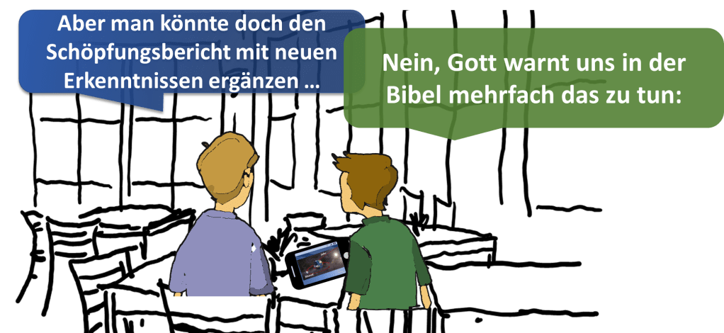 Im Buch der Psalmen werden wir ermahnt – darauf hingewiesen – dass das Gesetz Gottes perfekt ist, seine Berichte vertrauenswürdig und ein Licht auf unserem Lebensweg ist (Psalm 19:8 / Psalm 119:105).[vii] Dazu lesen wir im Buch der Sprüche (30: 5-6) die Bekanntmachung, dass die Worte Gottes absolut rein (also fehlerfrei) sind und wir ihnen nichts hinzufügen sollen.[viii] Diese Warnung, dass wir Gottes Worten nichts hinzufügen sollen, finden sich auch in 5 Mose 4:2 und Offenbarung 22:18-19.