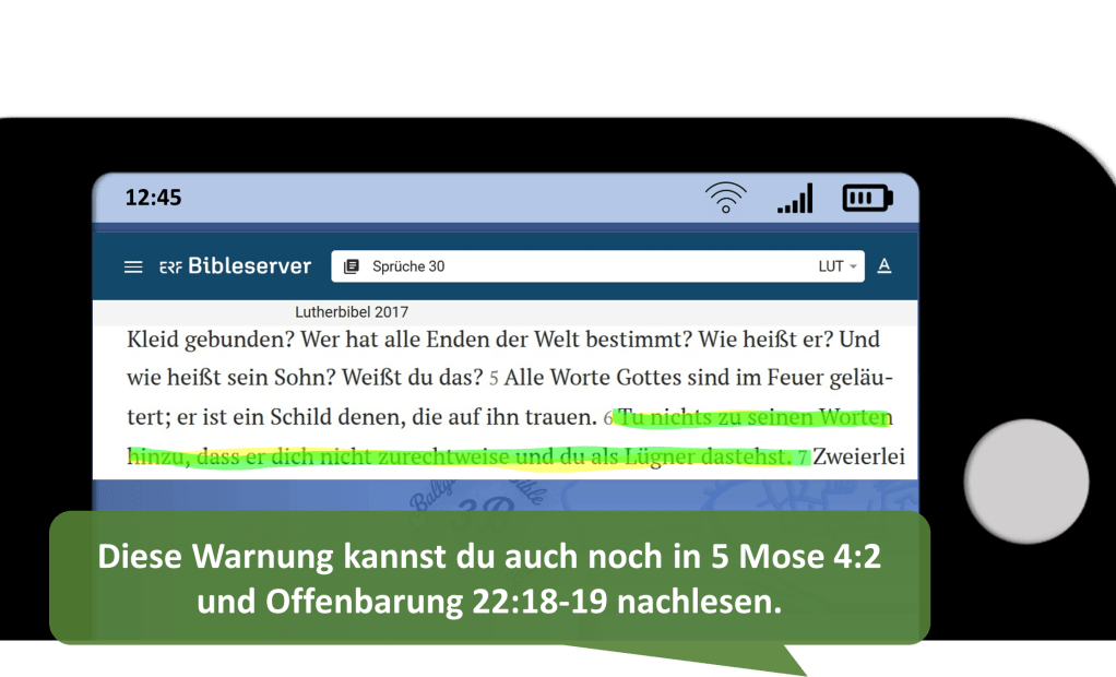 [viii] Sprüche 30:5-6 / 5 Alle Worte Gottes sind im Feuer geläutert; er ist ein Schild denen, die auf ihn trauen. 6 Tu nichts zu seinen Worten hinzu, dass er dich nicht zurechtweise und du als Lügner dastehst.