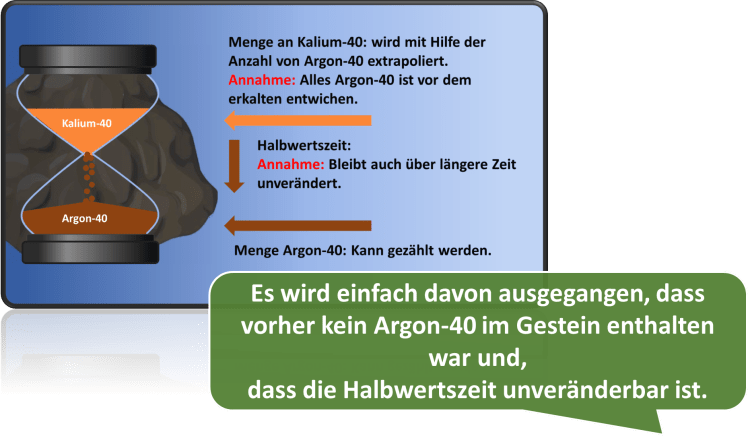 Diese Annahmen sind nicht verifizierbare, glaubensbasierte Annahmen. Es ist der Glaube an diesen Naturalismus (es gibt nur die Natur (das Universum) und sonst nichts), dem säkulare Wissenschaftler nachfolgen. Aus diesem Glauben heraus lehnen sie die Berichte der Bibel über Gottes Schöpfungswirken und eine weltumspannende Flut ab. Diese Ereignisse beeinflussten aber die ursprüngliche Menge von Elementen (und deren Isotope) in Gesteinen, deren Zerfallsrate und Verunreinigungen (Isotope die nachträglich ins Gestein eingebracht wurden). Das bedeutet, dass diese Experten einfach davon ausgehen, dass die Bibel falsch liegt, was wiederum zeigt, dass diese Experten nicht neutral sind, wenn sie biblische Berichte lesen und bewerten.