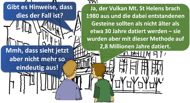 Dazu gibt es wenige Jahrzehnte alte Befunde, die zeigen, dass radiometrische Datierungsmethoden sehr unzuverlässige Daten abliefern. Zwischen dem 16. März und dem 18. Mai 1980 kam es am Mt. St Helens (Washington State) zu Erdbeben und letztendlich zu einem verheerenden Vulkanausbruch[v]. Die ausgebrochene Lava war schließlich im Jahr 1986 erkaltet, und die Zerfallsprozesse der Isotope begannen[vi]. Einige dieser Proben wurden mit der Kalium-Argon[vii] Methode zu Beginn der 2000-Jahre datiert – auf über 2,8 Millionen von Jahren![viii]