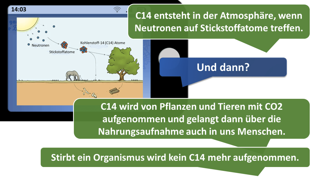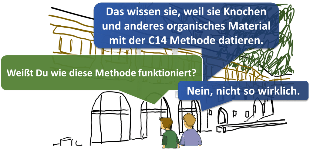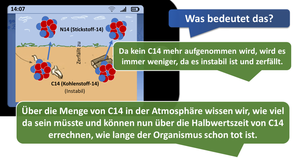 Das Isotop C14 (Kohlenstoff 14) ist ein instabiles Element, das in der Atmosphäre aus Stickstoff gebildet wird und von Pflanzen in Form von CO2 (Kohlenstoffdioxid) aufgenommen wird (Photosynthese). Tiere fressen diese Pflanzen und wir Menschen ernähren uns von diesen Pflanzen und Tieren und so kommt C14 in alle lebenden Organismen. Nach seinem Tod nimmt der Organismus (Pflanzen, Tiere, Menschen) kein C14 mehr auf. Da C14 ziemlich schnell zerfällt wird daraus in sehr kurzer Zeit Stickstoff 14. Berechnungen ergeben, dass bei dieser schnellen Zerfallsrate nach etwa 100 000 Jahren C14 in einem Organismus in so geringen Mengen vorkommt, dass ein Nachweis nicht mehr möglich sein sollte.
