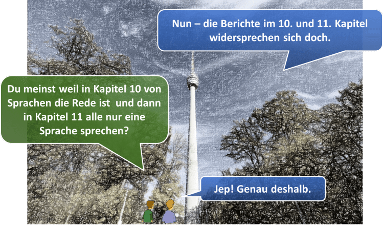 Ein Einwand, der oft erhoben wird, ist der, dass es Widersprüche zwischen den Kapiteln 10 und 11 gäbe. In Kapitel 10 lesen wir, dass die Menschen aufgrund ihrer Sprachen in verschiedene Nationen zerstreut wurden (1. Mose 10:5). In Kapitel 11:1 steht hingegen, dass „alle Welt einerlei Zunge und Sprache“ teilte.