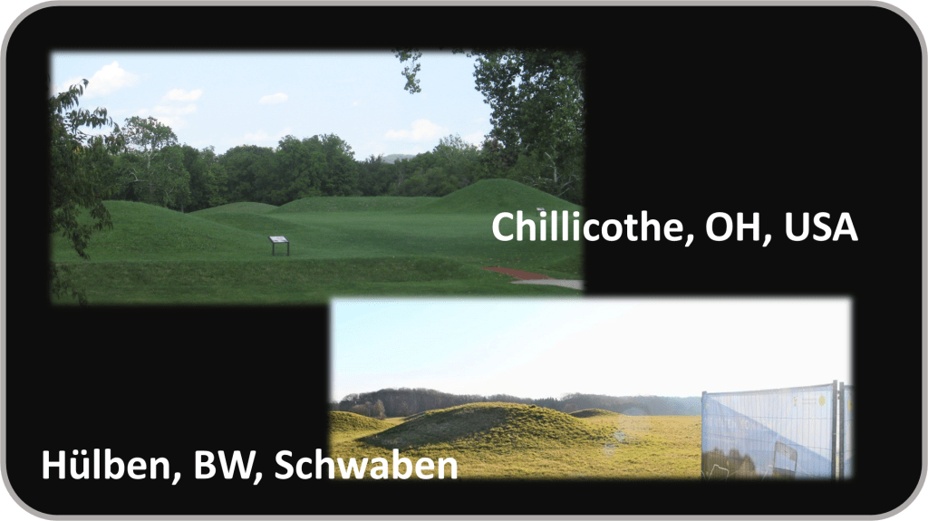 3 Zikkurats, Grabhügel und Pyramiden – rund um die Welt gibt es in unterschiedlichsten Kulturen Bauwerke sehr ähnlicher Bauart. Es ist sehr wahrscheinlich, dass der Turm zu Babel (wahrscheinlich eine Zikkurat) als Vorbild für diese Bauwerke diente[iv]. Für die in unserer Gegend bekannten „Burren“ zwischen Grabenstetten und Hülben gibt es ähnliche Hügel der Hopewell Culture in Chilicothe, OH, USA.
