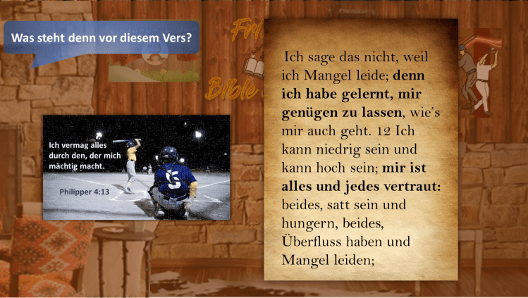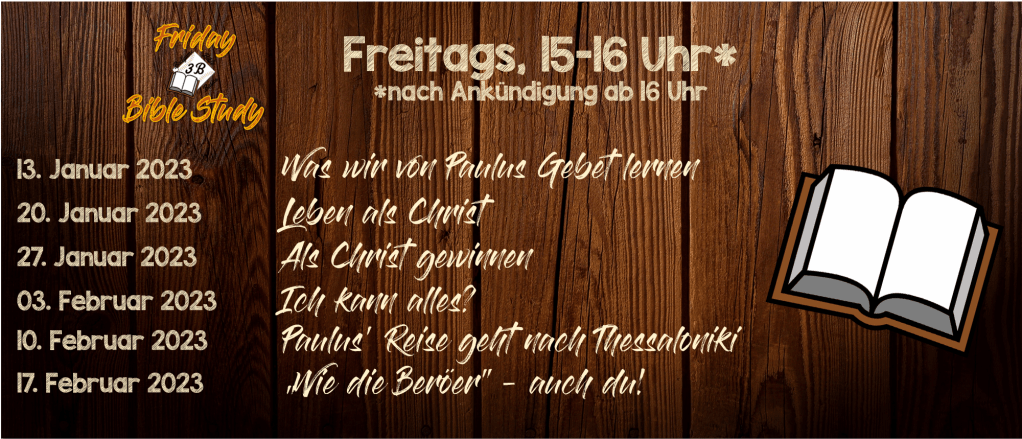 Wie in den Major Leagues spielt auch 3B in den Wintermonaten kein Basenball – auf die BibleTime wollen wir trotzdem nicht verzichten. Wir treffen uns jeden Freitag wie gewohnt um 15 Uhr – doch von November bis Ende März um uns mit Gottes Wort zu beschäftigen. Dieses Jahr könnt Ihr mehr über Paulus und die Philipper lernen. Und wie gewohnt gibt es einen Snack – oder Plätzchen im Advent. Wir freuen uns auf Euch!