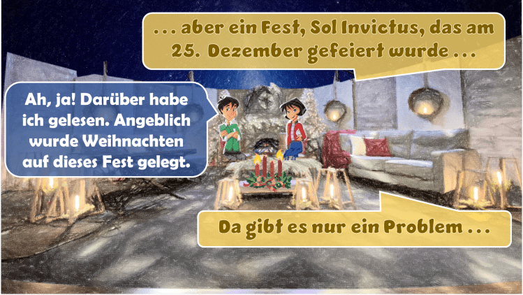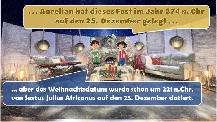 Ein weiteres mögliches Fest ist Sol Invictus. Bei diesem Fest wurde tatsächlich am 25. Dezember dem Sonnengott gehuldigt[iii]. Allerdings legte Aurelian erst im Jahr 274 n.Chr. Sol Invictus auf den 25. Dezember, etwas mehr als 50 Jahre nach dem Sextus Julius Africanus[iv] das Geburtsdatum von Jesus auf den 25. Dezember datiert hatte[v].