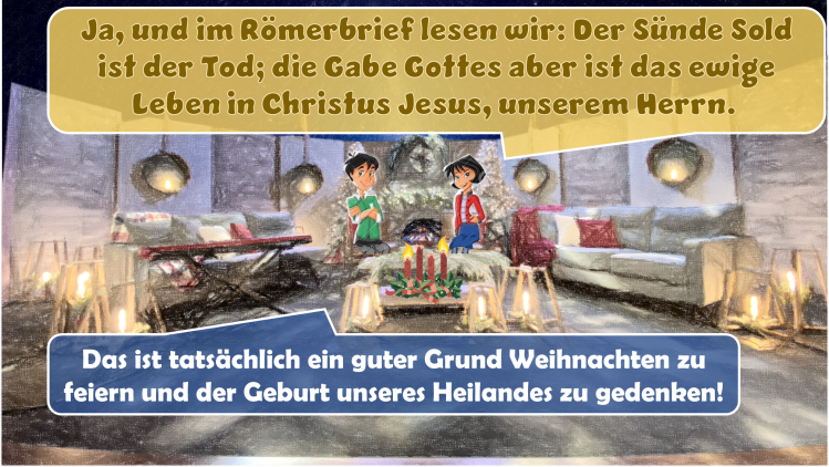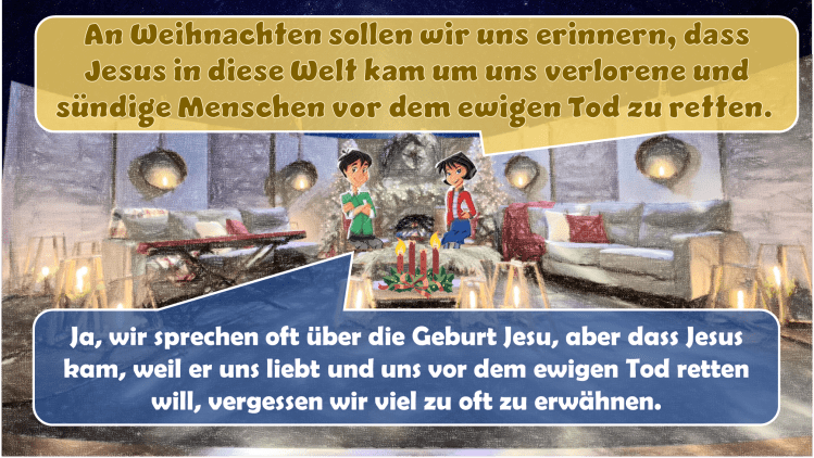 Als Christen sprechen wir an Weihnachten oft über die Geburt von Jesus und vergessen, zu erwähnen warum er kam. Ob wir uns dabei an Jesus‘ Geburt an oder in der Nähe eines heidnischen Feiertages erinnern ist irrelevant. Wichtig ist, dass uns die weltlichen Traditionen und Gebräuche, z.B. der Weihnachtsmann, Weihnachtsmärkte und die glanzvollen Dekorationen nicht wichtiger werden als die Erinnerung daran, dass Jesus geboren wurde um uns verlorene Menschen zu retten.