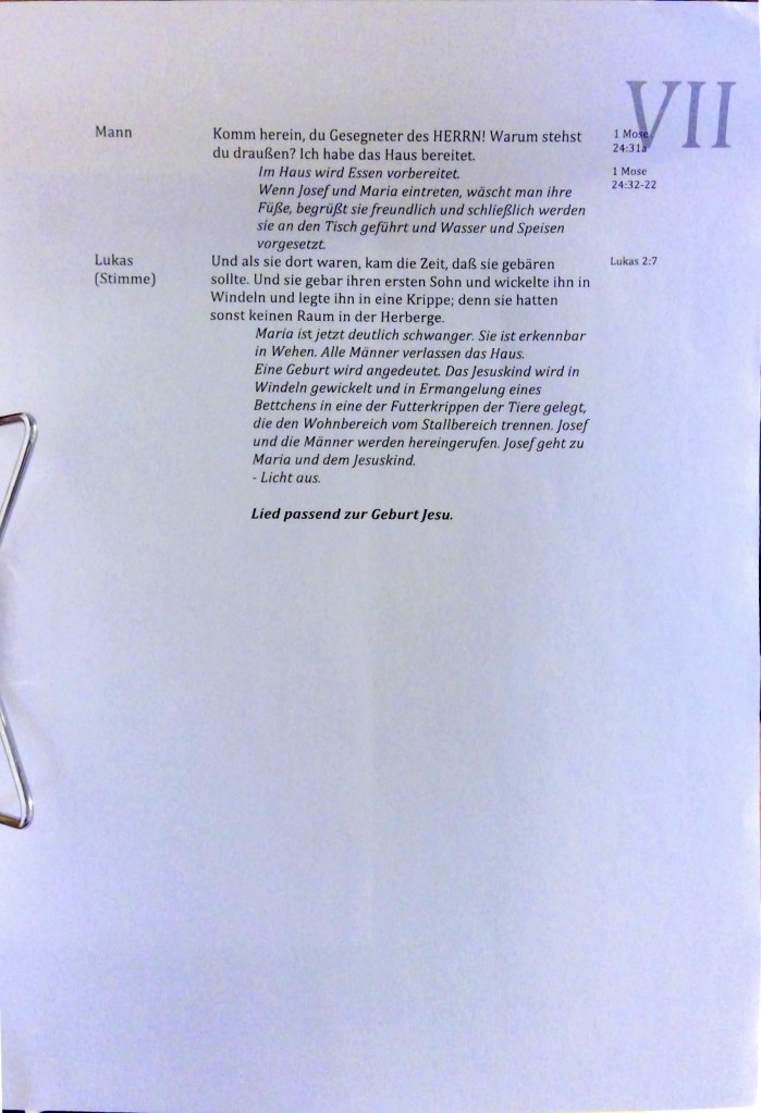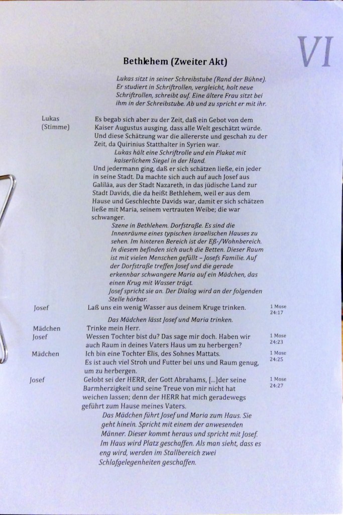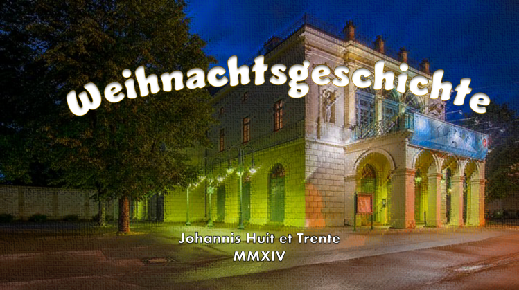 1 Es begab sich aber zu der Zeit, dass ein Gebot von dem Kaiser Augustus ausging, dass alle Welt geschätzt würde. 2 Und diese Schätzung war die allererste und geschah zur Zeit, da Quirinius Statthalter in Syrien war. 3 Und jedermann ging, dass er sich schätzen ließe, ein jeglicher in seine Stadt. 4 Da machte sich auf auch Josef aus Galiläa, aus der Stadt Nazareth, in das judäische Land zur Stadt Davids, die da heißt Bethlehem, darum dass er von dem Hause und Geschlechte Davids war, 5 auf dass er sich schätzen ließe mit Maria, seinem vertrauten Weibe; die war schwanger. 6 Und als sie daselbst waren, kam die Zeit, dass sie gebären sollte. 7 Und sie gebar ihren ersten Sohn und wickelte ihn in Windeln und legte ihn in eine Krippe; denn sie hatten sonst keinen Raum in der Herberge.
