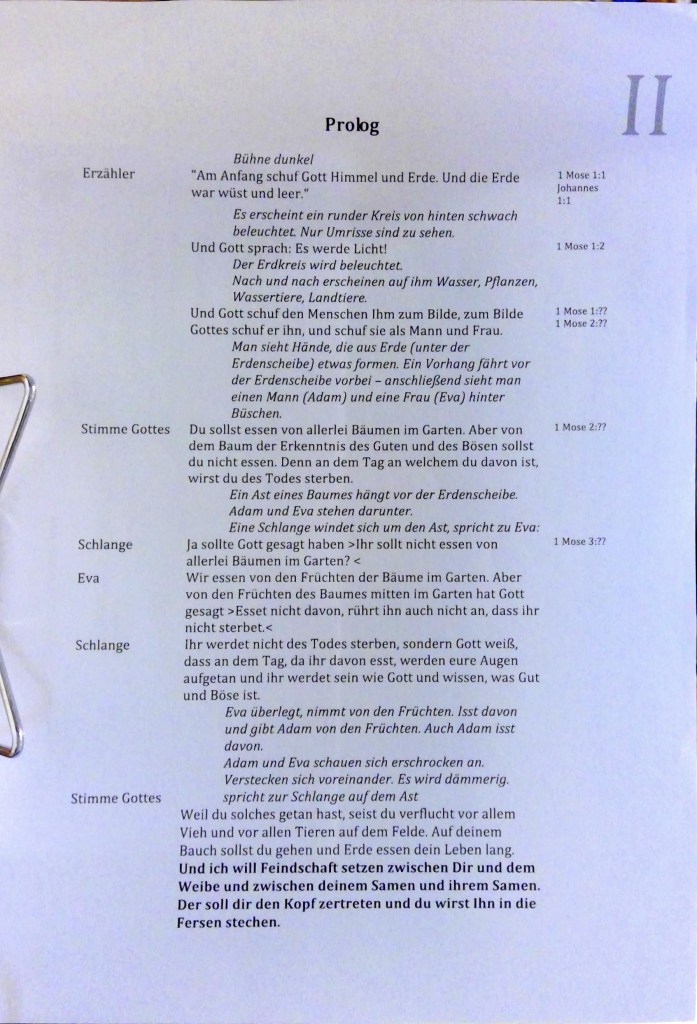 14 Da sprach Gott der HERR zu der Schlange: Weil du das getan hast, seist du verflucht vor allem Vieh und allen Tieren auf dem Felde. Auf deinem Bauche sollst du kriechen und Staub fressen dein Leben lang. 15 Und ich will Feindschaft setzen zwischen dir und der Frau und zwischen deinem Samen und ihrem Samen; er wird dir den Kopf zertreten, und du wirst ihn in die Ferse stechen. […] 21 Und Gott der HERR machte Adam und seiner Frau Röcke von Fellen und zog sie ihnen an.