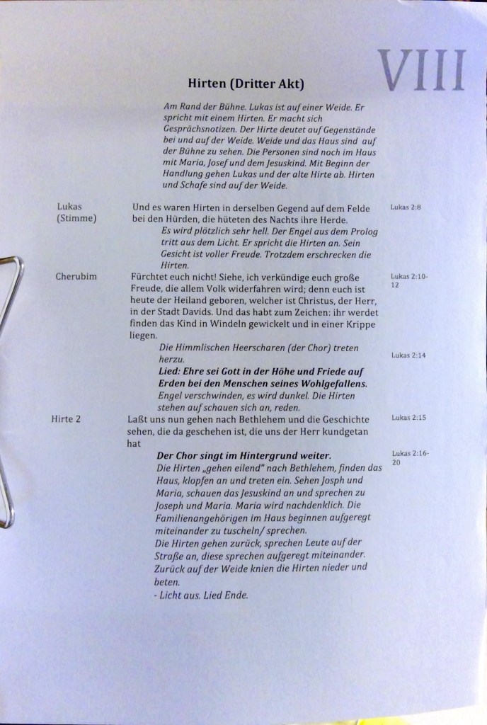 8 Und es waren Hirten in derselben Gegend auf dem Felde bei den Hürden, die hüteten des Nachts ihre Herde. 9 Und des Herrn Engel trat zu ihnen, und die Klarheit des Herrn leuchtete um sie; und sie fürchteten sich sehr. 10 Und der Engel sprach zu ihnen: Fürchtet euch nicht! Siehe, ich verkündige euch große Freude, die allem Volk widerfahren wird; 11 denn euch ist heute der Heiland geboren, welcher ist Christus, der Herr, in der Stadt Davids. 12 Und das habt zum Zeichen: Ihr werdet finden das Kind in Windeln gewickelt und in einer Krippe liegen. 13 Und alsbald war da bei dem Engel die Menge der himmlischen Heerscharen, die lobten Gott und sprachen: 14 Ehre sei Gott in der Höhe und Friede auf Erden bei den Menschen seines Wohlgefallens[3]. 15 Und da die Engel von ihnen gen Himmel fuhren, sprachen die Hirten untereinander: Lasst uns nun gehen gen Bethlehem und die Geschichte sehen, die da geschehen ist, die uns der Herr kundgetan hat. 16 Und sie kamen eilend und fanden beide, Maria und Josef, dazu das Kind in der Krippe liegen. 17 Da sie es aber gesehen hatten, breiteten sie das Wort aus, welches zu ihnen von diesem Kinde gesagt war. 18 Und alle, vor die es kam, wunderten sich über die Rede, die ihnen die Hirten gesagt hatten. 19 Maria aber behielt alle diese Worte und bewegte sie in ihrem Herzen. 20 Und die Hirten kehrten wieder um, priesen und lobten Gott für alles, was sie gehört und gesehen hatten, wie denn zu ihnen gesagt war.