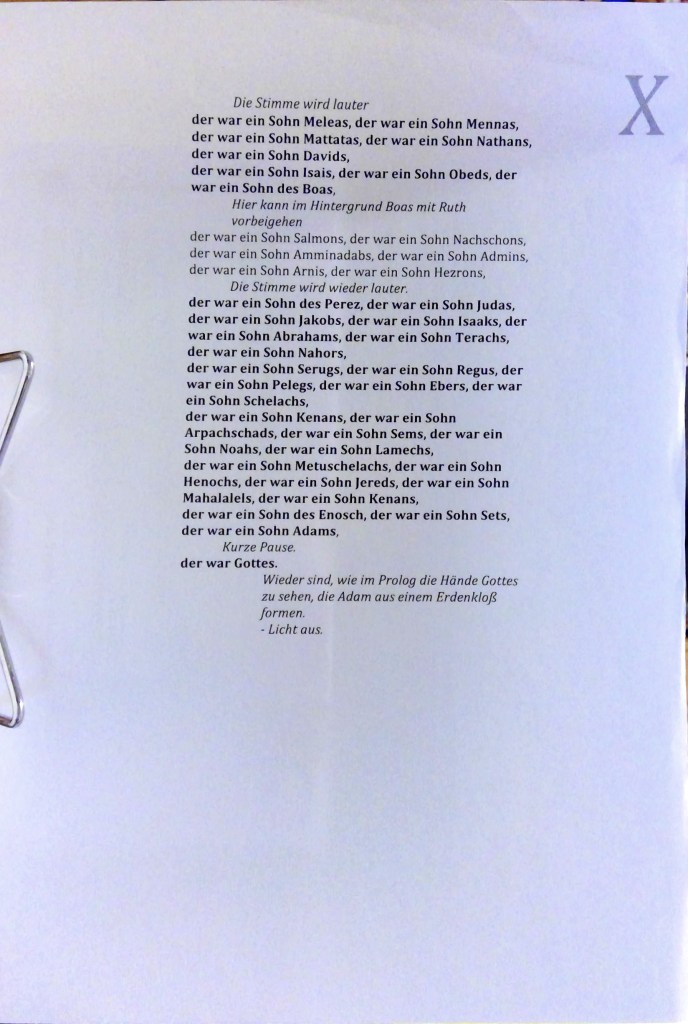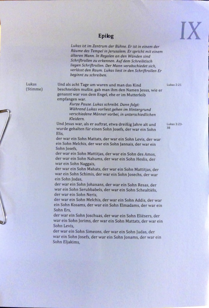 23 Und Jesus war, als er auftrat, etwa dreißig Jahre alt und wurde gehalten für einen Sohn Josefs, der war ein Sohn Elis, 24 der war ein Sohn Mattats, der war ein Sohn Levis, der war ein Sohn Melchis, der war ein Sohn Jannais, der war ein Sohn Josefs, 25 der war ein Sohn Mattitjas, der war ein Sohn des Amos, der war ein Sohn Nahums, der war ein Sohn Heslis, der war ein Sohn Naggais, 26 der war ein Sohn Mahats, der war ein Sohn Mattitjas, der war ein Sohn Schimis, der war ein Sohn Josechs, der war ein Sohn Jodas, 27 der war ein Sohn Johanans, der war ein Sohn Resas, der war ein Sohn Serubbabels, der war ein Sohn Schealtiëls, der war ein Sohn Neris, 28 der war ein Sohn Melchis, der war ein Sohn Addis, der war ein Sohn Kosams, der war ein Sohn Elmadams, der war ein Sohn Gers, 29 der war ein Sohn Joschuas, der war ein Sohn Eliësers, der war ein Sohn Jorims, der war ein Sohn Mattats, der war ein Sohn Levis, 30 der war ein Sohn Simeons, der war ein Sohn Judas, der war ein Sohn Josefs, der war ein Sohn Jonams, der war ein Sohn Eljakims, 31 der war ein Sohn Meleas, der war ein Sohn Mennas, der war ein Sohn Mattatas, der war ein Sohn Natams, der war ein Sohn Davids, 32 der war ein Sohn Isais, der war ein Sohn Obeds, der war ein Sohn des Boas, der war ein Sohn Salas, der war ein Sohn Nachschons, 33 der war ein Sohn Amminadabs, der war ein Sohn Admins, der war ein Sohn Arnis, der war ein Sohn Hezrons, der war ein Sohn des Perez, der war ein Sohn Judas, 34 der war ein Sohn Jakobs, der war ein Sohn Isaaks, der war ein Sohn Abrahams, der war ein Sohn Terachs, der war ein Sohn Nahors, 35 der war ein Sohn Serugs, der war ein Sohn Regus, der war ein Sohn Pelegs, der war ein Sohn Ebers, der war ein Sohn Schelachs, 36 der war ein Sohn Kenans, der war ein Sohn Arpachschads, der war ein Sohn Sems, der war ein Sohn Noahs, der war ein Sohn Lamechs, 37 der war ein Sohn Metuschelachs, der war ein Sohn Henochs, der war ein Sohn Jereds, der war ein Sohn Mahalalels, der war ein Sohn Kenans, 38 der war ein Sohn des Enosch, der war ein Sohn Sets, der war ein Sohn Adams. Der war Gottes.
