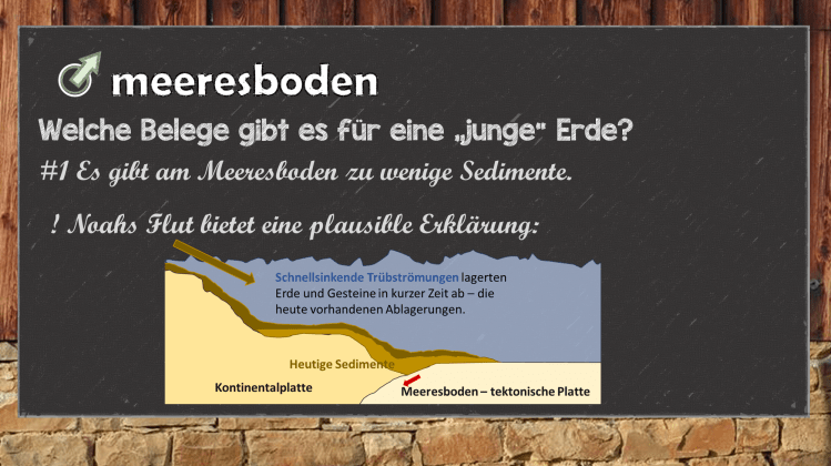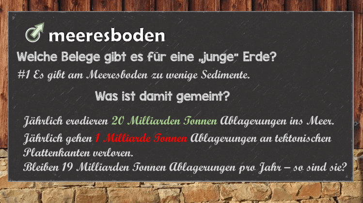 „Es gibt am Meeresboden zu wenige Sedimente (Ablagerungen) für eine mehrere Milliarden Jahre alte Erde!“ – was ist damit gemeint? Wenn sich Sedimente über Milliarden von Jahren auf dem Meeresboden ablagern[i], sollten es auf dem ursprünglichen Meeresboden Ablagerungen von mehreren Kilometern Höhe geben.
