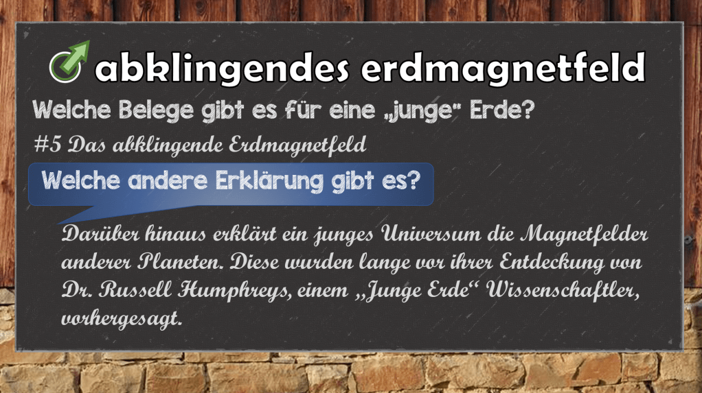 Verlässliche, exakte und veröffentlichte Daten bestätigen nachdrücklich das Modell einer jungen Erde. Ein abklingender elektrischer Strom im äußeren Kern verursacht das Erdmagnetfeld. Das Erdmagnetfeld hat im Verlauf der Geschichte mehrfach seine Richtung geändert (z.B. während Noahs Flut) und verliert seit Beginn der Schöpfung seine Energie. Alles deutet darauf hin, dass die Erde und ihr Magnetfeld nur etwa 6000 Jahre alt sind.