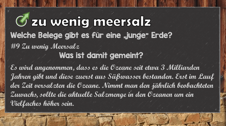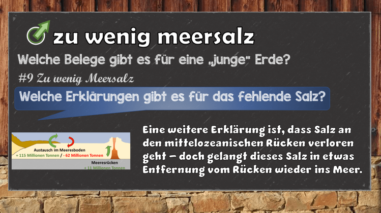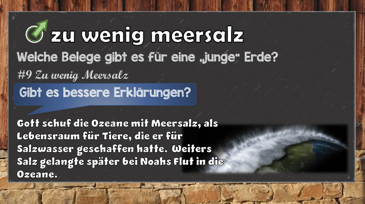 Die heute messbare Menge an Salz ist, geht man von dem biblischen Alter der Erde von etwa 6000 Jahren aus, plausibler zu erklären[iii].