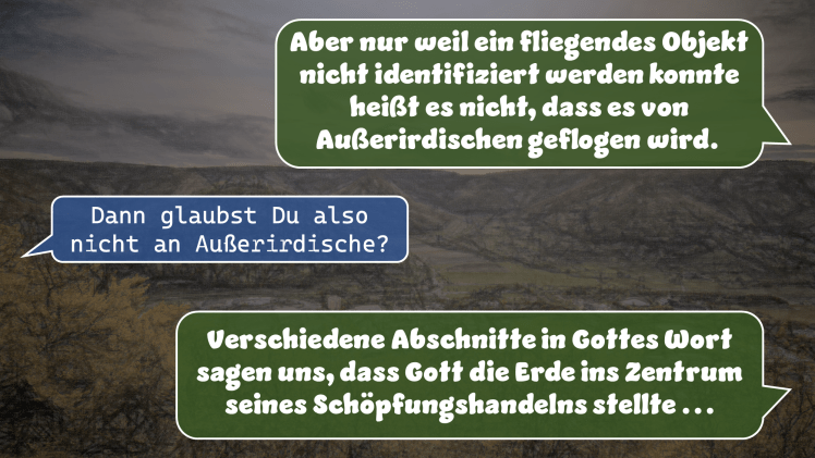 Die Frage nach UFOs gibt Christen auch immer eine gute Möglichkeit auf die Trennung der Menschheit von Gott hinzuweisen und aufzuzeigen, dass genau deshalb Gott Mensch werden musste um für unsere Schuld zu sterben damit wir wieder Gemeinschaft mit Gott haben können.