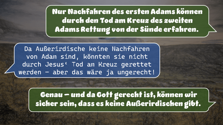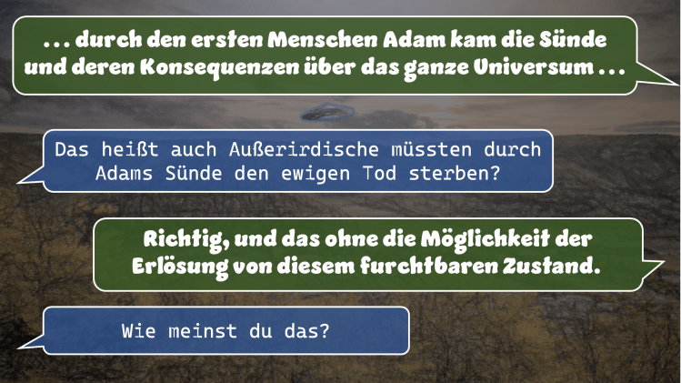 Und das wäre ein Problem für intelligente Wesen in anderen Regionen des Universums, denn sie wären vom Sündenfall ohne ihr Zutun durch Adams Sünde betroffen (Römer 8:22). Da der Sünde Sold der Tod ist (Römer 6:23) würde auch ihr Planet[v] eines Tages zerstört und sie müssten sterben (1 Korinther 15:22) – ohne die Möglichkeit auf Erlösung, denn diese Segnung ist nur den Nachkommen von Adam versprochen: