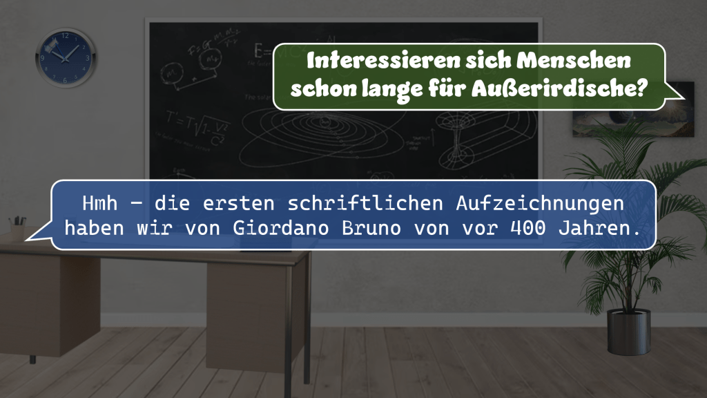 Die ersten bekannten schriftlichen Ausarbeitungen zu Leben auf anderen Welten wurden von Giordano Bruno (1548–1600)[ii] verfasst. Er lebte zu Beginn der Zeit, in der das geozentrische Weltbild[iii] durch das heliozentrische Weltbild[iv] abgelöst wurde. G Bruno ging über diese, damals noch ohne Belege formulierten, Gedanken hinaus, in dem er sagte, das Universum habe keinen Mittelpunkt. Er ging von Leben außerhalb der Erde aus, da er jeden Stern als eine eigene Welt betrachtete, auf der es Leben gäbe. Erst mit Galileo Galileis Beobachtungen der Jupitermonde 1610 gab es erste Belege für das heliozentrische Weltbild[v].