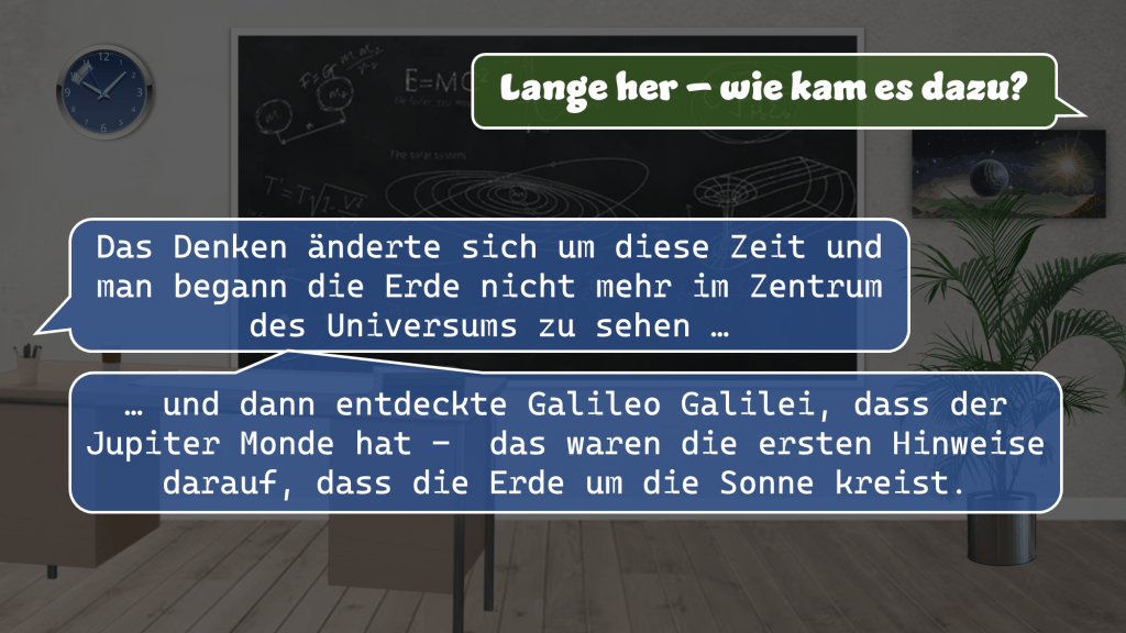 [v] G. Galileis heliozentrisches Weltbild stand der Jahrhunderte alten geozentrischen Lehre entgegen. Geozentrische Kosmologie (Lehre von der Welt/ des Universums) entspringt nicht dem Wort Gottes, der Bibel. Diese Lehre wurde von Aristoteles (384-322 n.Chr.) ausgearbeitet und erhielt durch Berechnungen von Claudius Ptolemäus (100-160 n.Chr.) seine Legitimation. Galilei wurde angeklagt, nicht weil er sich gegen Gottes Wort stellte, sondern weil er einer jahrhundertealten, griechischen Lehre widersprach, die in den Bibliotheken und Universitäten der Kirche bewahrt und unterrichtet wurde.