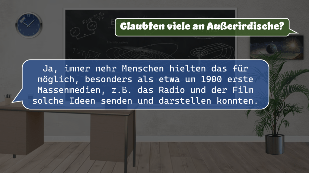 Etwa zur gleichen Zeit gab es erste Schritte um bewegte Bilder zu projizieren und Radioübertragungen wurden etwas später möglich. Diese neuen Medien trugen viel zur Verbreitung von Science-Fiction bei. Die bekanntesten Veröffentlichungen aus dieser Zeit sind sicher das Buch (1898) und Hörspiel (1938) „Krieg der Welten“ von Orson Welles und der Film „Der Tag an dem die Erde stillstand“ (1951). Die neuen Medien trugen auch deshalb so viel zum Glauben an außerirdisches Leben bei, da um die Jahrhundertwende (1900) Astronomen angeblich Kanäle und Vegetation auf dem Mars entdeckten[ix]. Weitere Nahrung erhielt der Glaube an Außerirdische durch Berichte im Roswell Daily Record im Jahr 1947 über die Sicherstellung von Bruchstücken einer „fliegenden Untertasse“ auf der Farm eines ansässigen Farmers, die dieser Wochen zuvor gefunden hätte. Sprecher der Air Force erklärten sofort im Anschluss an die Veröffentlichung, dass ein Wetterballon sichergestellt wurde und kein außerirdisches Raumschiff und die Geschichte wurde bald fast vergessen. Doch hatten andere Medien schon über die „fliegende Untertasse“ berichtet und bald schon berichteten viele andere Piloten von UFO-Sichtungen. Und obwohl die Air Force bis Ende der 60er Jahre des letzten Jahrhunderts mehrere Untersuchungen veranlasste, die alle keine Außerirdischen Besucher bestätigen konnte, verlor der Glaube an Außerirdische nicht an Kraft. Das Vertrauen in Regierungsbehörden war durch die Kommunikation zum Vietnamkrieg (1955-1975) und den Watergate Skandal (1972-74) beschädigt und die Ergebnisse der Untersuchungen wurden von Vielen angezweifelt. Und so kam es, dass der Vorfall von Roswell aus dem Jahr 1947 wieder entdeckt und in Zweifel gezogen wurde. Diese anhaltenden Zweifel an der Aufrichtigkeit von Regierungsbehörden sind letzten Endes auch die Ursache für die Anhörungen zu UFO-Sichtungen vor dem US-Kongress im Juli 2023 um die Frage zu klären, ob wir auf der Erde von Außerirdischen besucht werden[x].