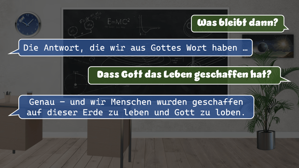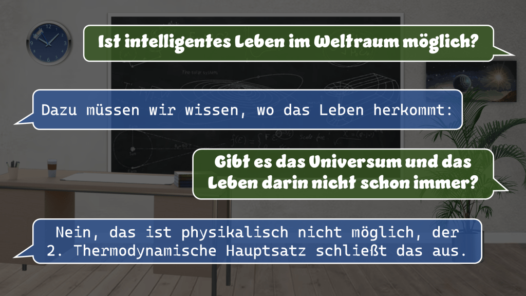 Auf die Frage nach der Entstehung des Lebens gibt es mehrere mögliche Antworten: Eine davon sagt, dass das Leben schon immer (also ewig existiert hat). Jedoch zeigt der Zweite Thermodynamische Hauptsatz[xi], dass Energie mit der Zeit immer weniger nutzbar wird, d.h. sie kann nicht mehr für irgendwelche energetischen Prozesse genutzt werden. Würde das Leben, und damit das Universum ewig existieren, wäre inzwischen alle Energie nicht mehr nutzbar. Da aber das Leben nutzbare Energie benötigt, ist dies ein Beleg dafür, dass das Universum nicht ewig ist. So bleiben noch zwei Antworten auf die Frage, woher das Leben kommt: Entweder das Leben hat sich aus toter Materie entwickelt (A-Biogenese) oder es wurde von Gott, dem Schöpfer geschaffen. Dies gilt nicht nur für unsere Erde, sondern auch für mögliches außerirdisches, intelligentes Leben.