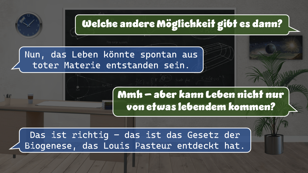 Schauen wir uns die erste Antwort an: Leben hat sich spontan aus toter Materie entwickelt. Louis Pasteur (1822-1895) fasste in einem Vortrag vor der Chemischen Gesellschaft zu Paris die Ergebnisse seiner Versuche und Beobachtungen zu dieser Frage zusammen[xii] und kam zu dem Schluss, dass Leben nicht aus toter Materie entstehen kann („Die Spontanerzeugung ist ein Hirngespinst“). Diese Ergebnisse sind als das Gesetz der Biogenese („Leben entsteht nur durch Leben“) bekannt. Alle bisherigen Beobachtungen bestätigen dieses Gesetz und es kann ausgeschlossen werden, dass dies an irgendeinem Punkt in der Vergangenheit anders war. Leben kommt nur von Leben.