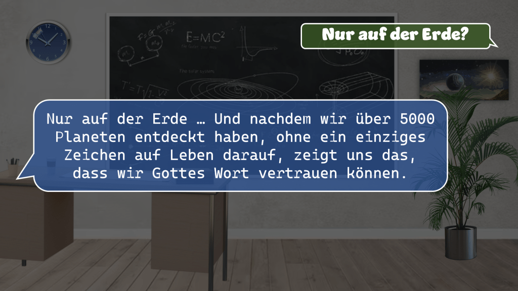 Alle bisher entdeckten Planetensysteme halten dem Wort Gottes stand: Von allen bisher 5000+ gefunden Planeten ist auf keinem Leben möglich[xiii], sind sogar lebensfeindlich. Gott schuf die Erde so, damit Leben auf ihr möglich ist. Nichts in diesem Vers deutet darauf hin, dass es irgendwo im Universum einen Ort gibt, auf dem Leben möglich ist.