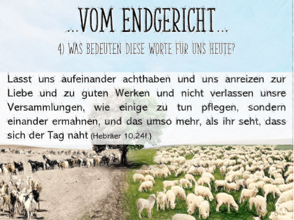 Zuletzt ist diese Rede vom Endgericht auch ein großer Ansporn für unser Leben als Christ. Ein Ansporn, dass wir an unseren Brüdern und Schwestern im Glauben Gutes tun, weil wir damit Jesus persönlich Gutes tun. Wenn wir anderen Christen helfen, tun wir ein Werk an Jesus höchstpersönlich. Stellt Euch mal eine Gemeinde vor, in der das jedem bewusst ist! Eine Gemeinde, die sich gegenseitig überbietet, einander Gutes zu tun, weil sie Jesus lieb hat und ihm Gutes tun will… So können wir dann auch die Ermahnung in Hebräer 10 verstehen:
