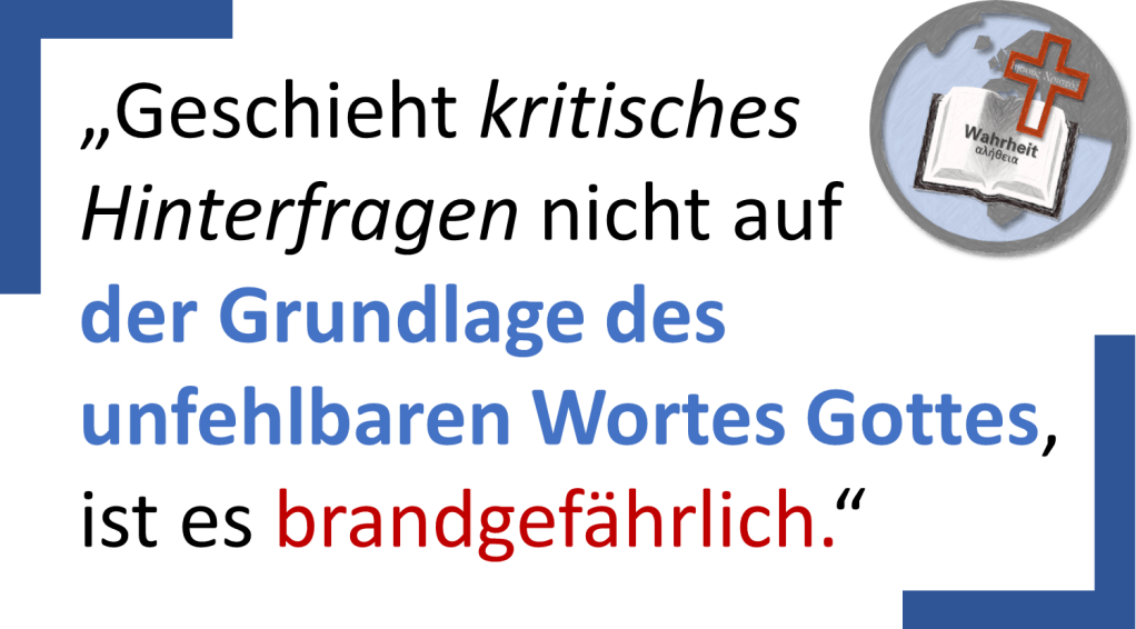 «Noch nie», schreibt Petrus, ist «eine Weissagung aus menschlichem Willen hervorgebracht worden, sondern getrieben von dem heiligen Geist haben Menschen im Namen Gottes geredet» (2. Petr. 1: 21). Deshalb schreibt der Apostel Johannes: «Wer darüber hinausgeht und bleibt nicht in der Lehre Christi, der hat Gott nicht» (2. Joh. 9). Gott spricht glasklar; wir tun gut daran, genau darauf zu achten. Kritisches Hinterfragen in Ehren. Doch geschieht es nicht auf der Grundlage des unfehlbaren Wortes Gottes, ist es brandgefährlich.