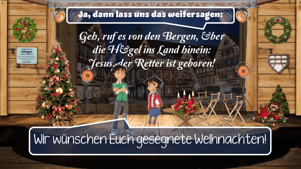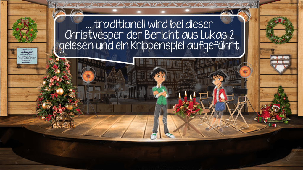 Noch kann das Licht nicht alle Dunkelheit dieser Welt vertreiben. Der feierlich erhellte, aber dennoch noch dunkle Raum ist dafür ein gutes Bild. Doch je mehr Menschen im Gottesdienst sind, umso heller strahlt auch der Raum. Für uns bedeutet das: „Geht, ruft es von den Bergen, ruft es in jedes Haus hinein – Jesus, der Retter ist geboren!“ Und eines Tages wird selbst dieser Lichterglanz verblassen, wenn Jesus, das Licht der Welt, unsere Ewigkeit erhellt.