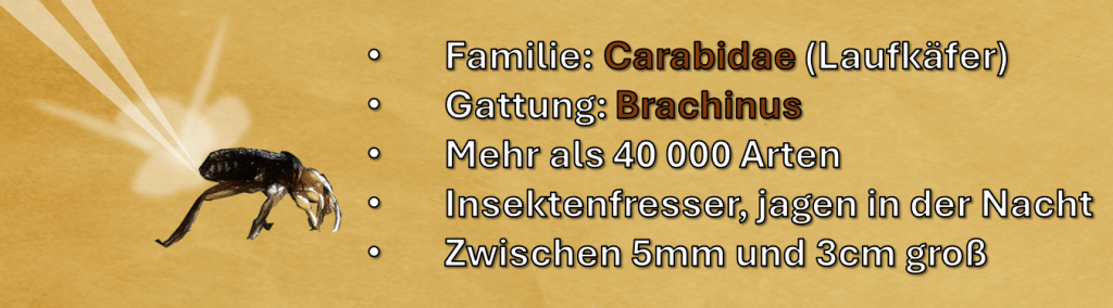 Das Hinterteil des Bombardierkäfers ist mit zwei Düsen, oder Drüsenöffnungen, ausgestattet um seine gasförmige Munition abzuschießen. Die Gase entstehen durch die Reaktion von Wasserstoffperoxid[ii] und Hydrochinon[iii]; wenn der Käfer seinen Schließmuskel zusammenzieht, mischen sich die beiden Chemikalien mit katalytischen Enzymen[iv]. Die daraus resultierende Energie erzeugt Temperaturen von bis zu 100°C. Damit sich der Käfer dabei nicht selbst verletzen kann, schließt sich die Einewegedüse um die inneren Organe zu schützen. Manche Arten Bombardierkäfer können mit ihren Drüsen in beinahe alle Richtungen schießen, indem sie scheibenförmige Reflektoren so ausrichten, dass diese die Gase in die gewünschte Richtung lenken. Diese Abwehrreaktion kann der Käfer mehrfach auslösen, dabei ist er so präzise wie ein Scharfschütze.