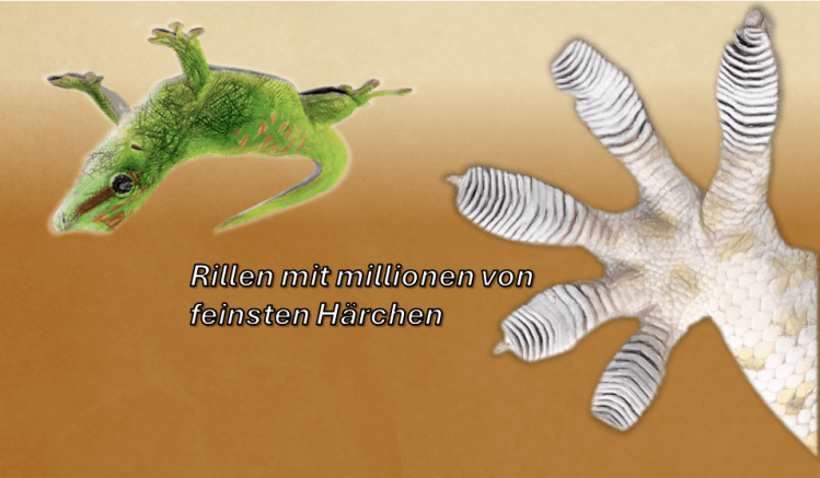 Die Enden der Härchen sind in hunderte von kleinsten Härchen gespalten. Biologen gehen davon aus, dass diese aufgespaltenen Enden der Härchen van der Waals Kräfte[i] produzieren, die so große Kräfte erzeugen, dass ein Gecko mit nur einem Zeh von der Decke hängen kann.