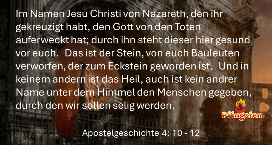 8 […] Ihr Oberen des Volkes und ihr Ältesten! 9 Wenn wir heute wegen der Wohltat an dem kranken Menschen verhört werden, wodurch er gesund geworden ist, 10 so sei euch allen und dem ganzen Volk Israel kundgetan: Im Namen Jesu Christi von Nazareth[1], den ihr gekreuzigt habt, den Gott von den Toten auferweckt hat; durch ihn steht dieser hier gesund vor euch. 11 Das ist der Stein, von euch Bauleuten verworfen, der zum Eckstein geworden ist. 12 Und in keinem andern ist das Heil, auch ist kein andrer Name unter dem Himmel den Menschen gegeben, durch den wir sollen selig werden. […] Apostelgeschichte 4: 8-12