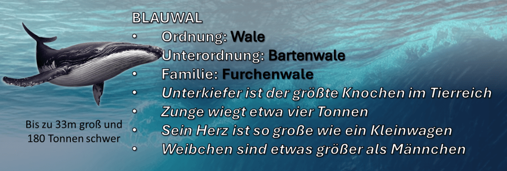 Auch wenn es für uns Menschen kaum hörbar ist, sind die Blauwale mit die lautesten Tiere im Tierreich[iv]. Es ist noch nicht geklärt, wie die Blauwale diese Laute erzeugen und es bis heute gibt es noch viel bei der Erforschung der Blauwale zu entdecken.